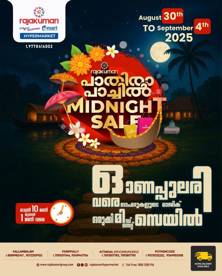 ഓണത്തിന് പർച്ചേഴ്സ് പ്രധാനമാണല്ലോ?പക്ഷെ തിരക്ക് പിടിച്ച ഓട്ടത്തിനടയിൽഅതിന് സാധിക്കാതെ വിഷമിക്കുകയാണോ!അതിനായി രാജകുമാരി ഒരുക്കുന്ന പാതിര സെയിൽ ഓഗസ്റ്റ് 30...