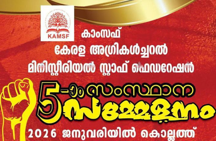 2026 ജനുവരി 19,20 തീയതികളിൽ കൊല്ലത്ത് നടക്കുന്ന കേരള അഗ്രികൾച്ചറൽ മിനിസ്റ്റീരിയൽ സ്റ്റാഫ് ഫെഡറേഷൻ (കാംസഫ്) അഞ്ചാം സംസ്ഥാന...