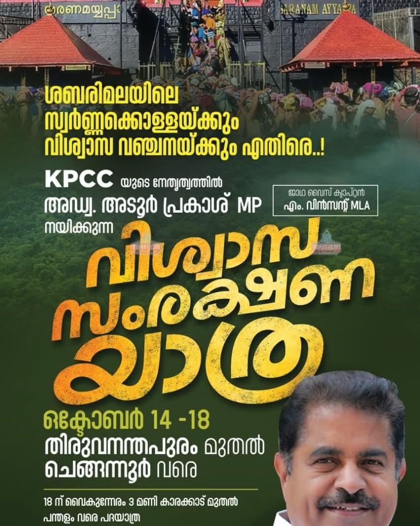 ശബരിമല സ്വർണ്ണപ്പാളി അഴിമതിയ്ക്കെ‌തിരെ കെപിസിസിയുടെ നേതൃത്വത്തിൽ വിശ്വാസ സംരക്ഷണയാത്ര സംഘടിപ്പിക്കുന്നു. അഡ്വക്കേറ്റ് അടൂർ പ്രകാശ് എം പി നയിക്കുന്ന വിശ്വാസ സംരക്ഷണയാത്ര 14 മുതൽ 18 വരെ തിരുവനന്തപുരം മുതൽ ചെങ്ങന്നൂർ വരെയാണ് സംഘടിപ്പിക്കുന്നത്.