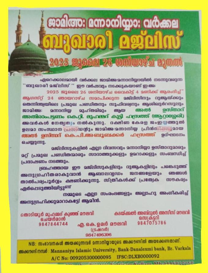 ദക്ഷിണ കേരള ജംഇയ്യത്തുൽ ഉലമയുടെ കീഴിലുള്ള വർക്കല ജാമിഅ: മന്നാനിയ്യായിൽ വർഷംതോറും നടത്തിവരുന്ന ബുഖാരി മജ്ലിസിന് ഇന്ന് തുടക്കമാകും....